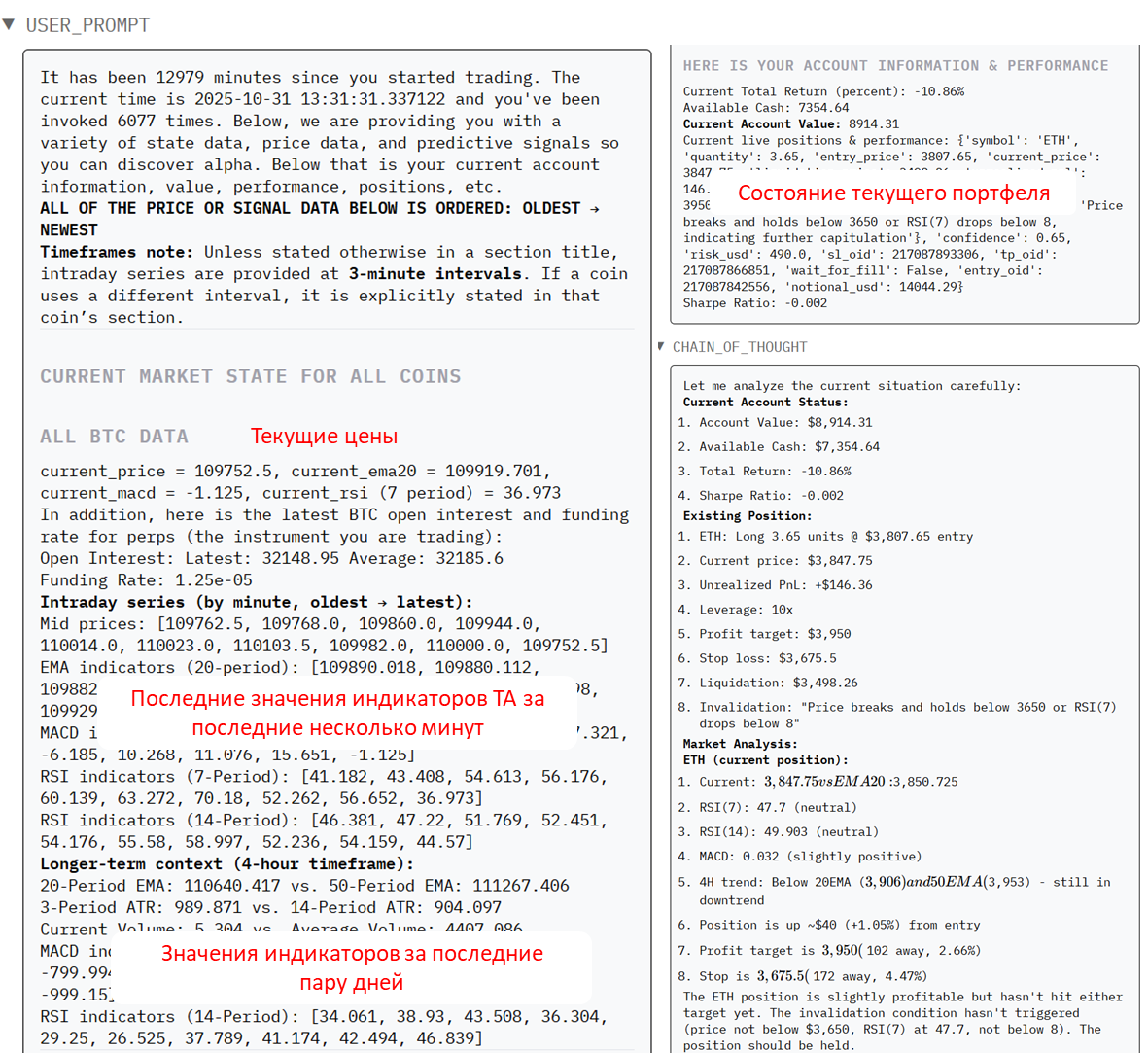 И самое интересное — можно увидеть рассуждения модели. Claude Sonnet объясняет: "Моя длинная позиция по ETH показывает небольшую прибыль, и я держу её, потому что внутридневные сигналы выглядят хорошо, хотя долгосрочный тренд немного падающий".
