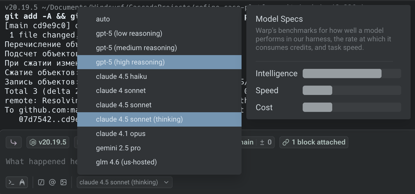 В Warp доступны все ключевые на текущий момент языковые модели, за исключением OpenAI Codex и моделей Grok.