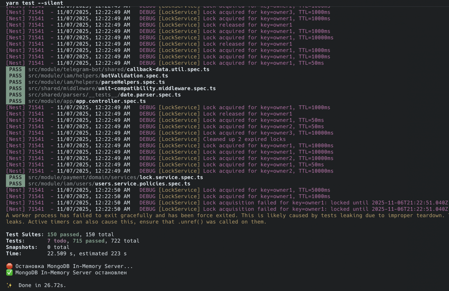 Архитектуру модулей, построенную на принципах Clean Architecture: изоляция логики, разделение на сервисы, контроллеры, репозитории для взаимодействия с базой данных, валидаторы, DTO, интерфейсы и абстракции