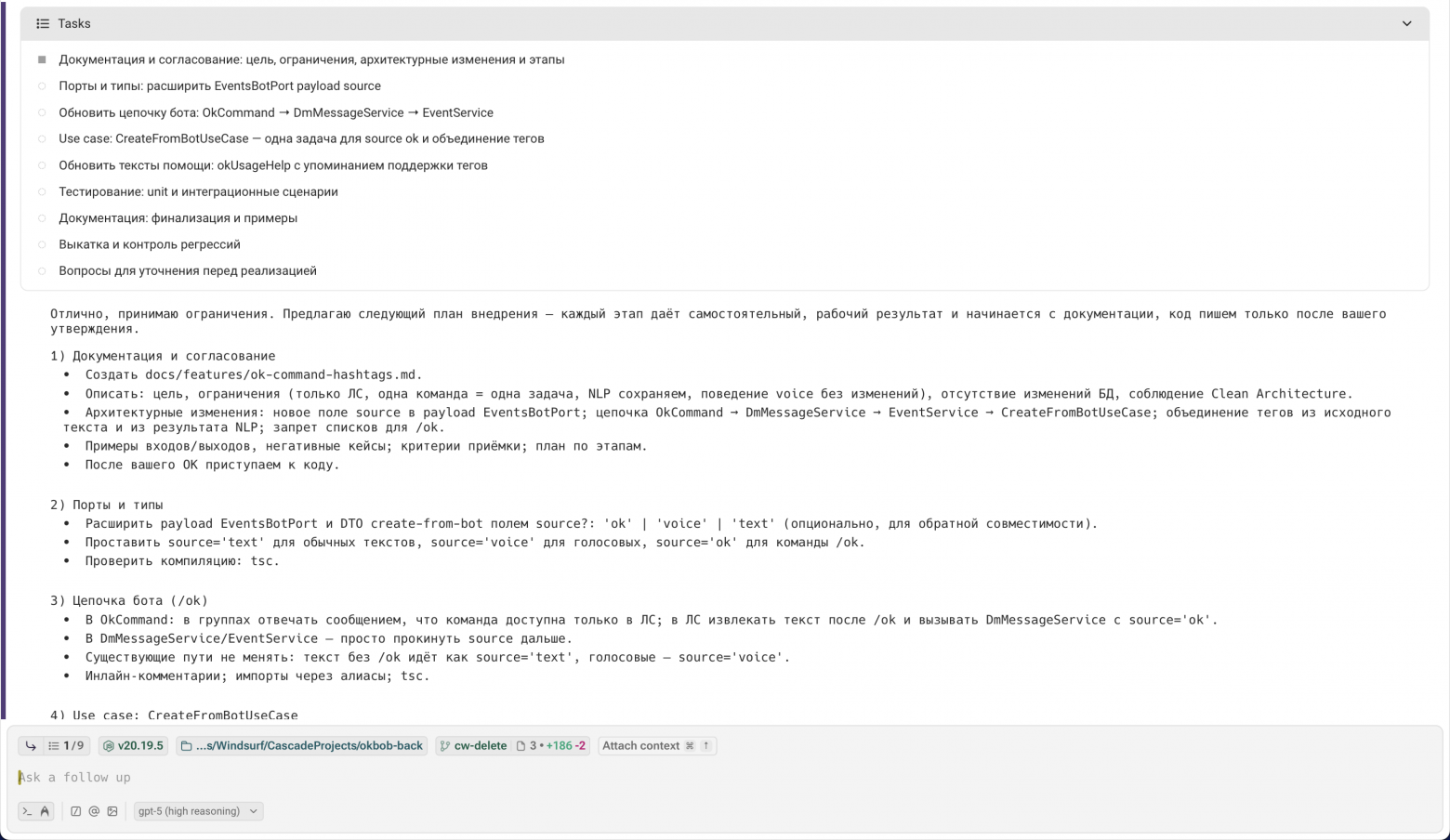 На сложных задачах я всегда выбираю GPT-5 High Reasoning: на ключевом проекте, о котором я расскажу ниже, у меня было несколько моментов, когда я решил поэкспериментировать и доверил задачи сложного рефакторинга модулей Claude Sonnet и Gemini – обе модели ушли не туда, и пришлось откатывать изменения. С GPT-5 я успешно завершил задуманное.