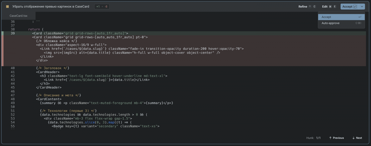 AI начинал писать код, а я выступал в роли ревьюера: в warp можно установить режим «автоприёмки», но это не всегда подходит, особенно если задача сложная. По умолчанию все изменения в файлах нужно согласовывать: если что-то не устраивает, можно отредактировать вручную или дать уточняющие инструкции для LLM.
