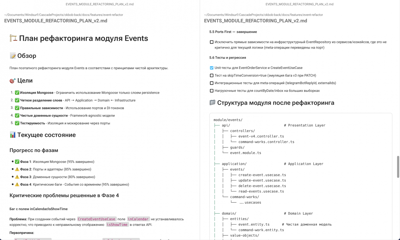 Это помогает удерживать LLM в рамках контекста. Даже если AI «забивает» свое окно контекста и начинает новый диалог, он всегда может вернуться к файлу с документацией и отметкой прогресса, посмотреть, что уже сделано, а что нет, и продолжить работу ровно с того места, где остановился. Я же, как тимлид, просто проверяю этот docs/ файл и правлю спецификацию, если AI что-то понял не так, пока не согласую ее и не пущу в работу.