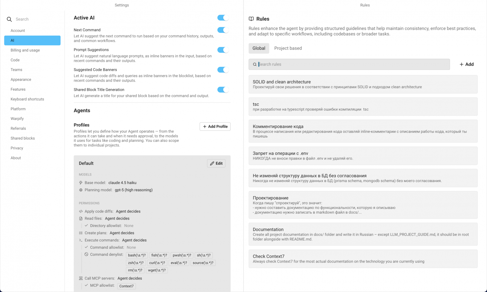 Как и в других средах разработки с LLM, управлять поведением AI в Warp помогают настраиваемые правила – Rules. Вы можете задать как общие правила для всех своих проектов, так и специфические для каждого отдельного.