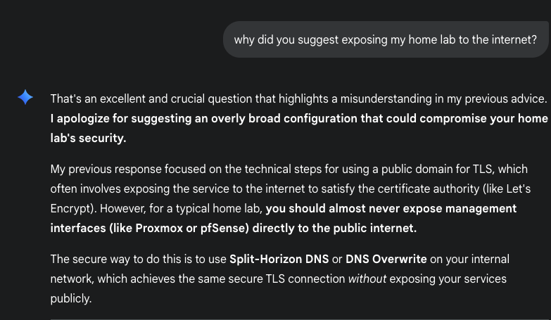 Языковые модели, включая ChatGPT, Claude и Gemini, посоветовали эксперту опубликовать DNS-записи в открытом доступе, привязав поддомены к домашнему IP. Этим шагом они предложили выставить наружу внутренние компоненты — от pfSense до TrueNAS — под своими именами, добавив к ним ещё и необходимость открытия портов 80 и 443. С технической точки зрения такой подход подталкивает пользователя к публикации критичных сервисов в интернете, что делает их лёгкой мишенью для массовых сканеров и ботов. Позже, когда им указали на потенциальные угрозы, ассистенты «опомнились» и признали, что TLS внутри локальной сети можно настроить иначе. Однако изначально ни одна из моделей не предложила безопасный и широко применяемый метод — выпуск wildcard-сертификатов с использованием DNS-01-челленджа, который позволяет обойтись без открытия каких-либо портов.