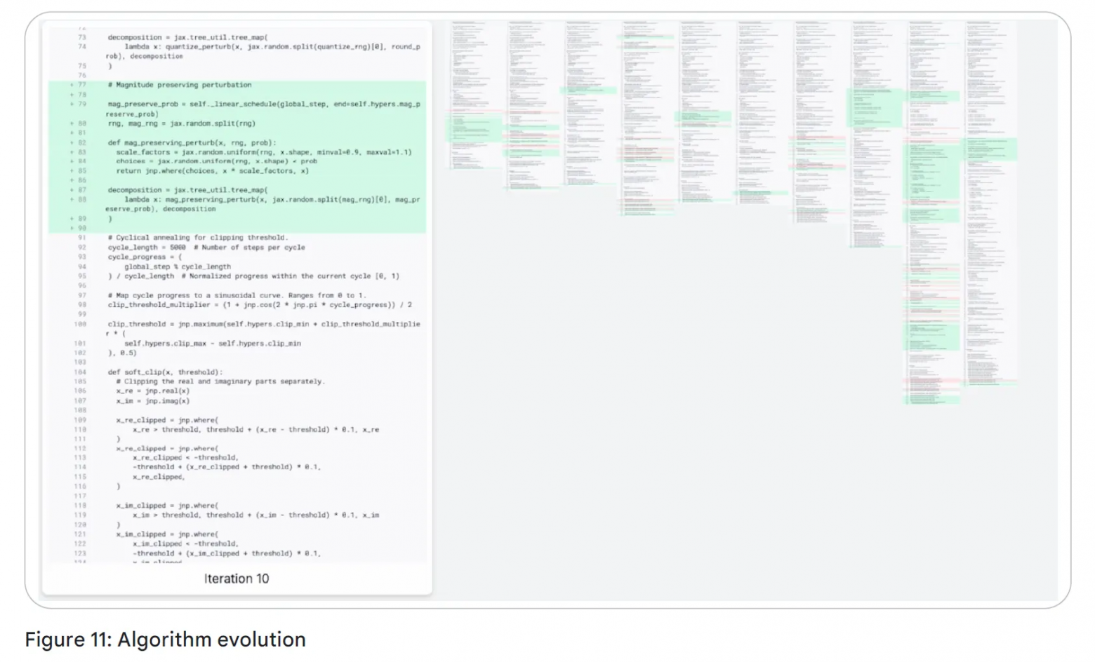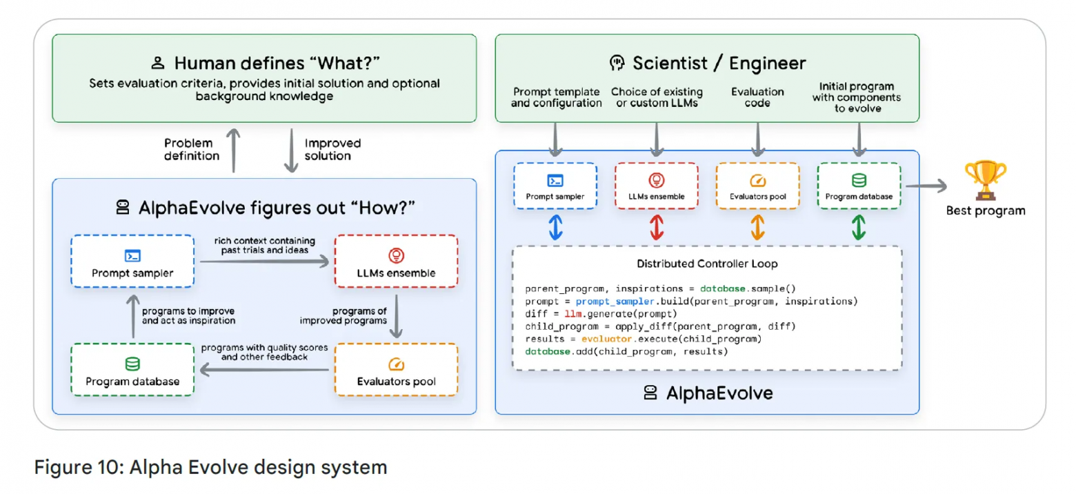 AlphaEvolve работает, сочетая возможности языковых моделей Gemini по генерации кода с автоматизированной системой оценки. Он использует эволюционный процесс: AI генерирует возможные решения, специальный оценщик присваивает им баллы, а самые перспективные идеи ложатся в основу следующего поколения кода.