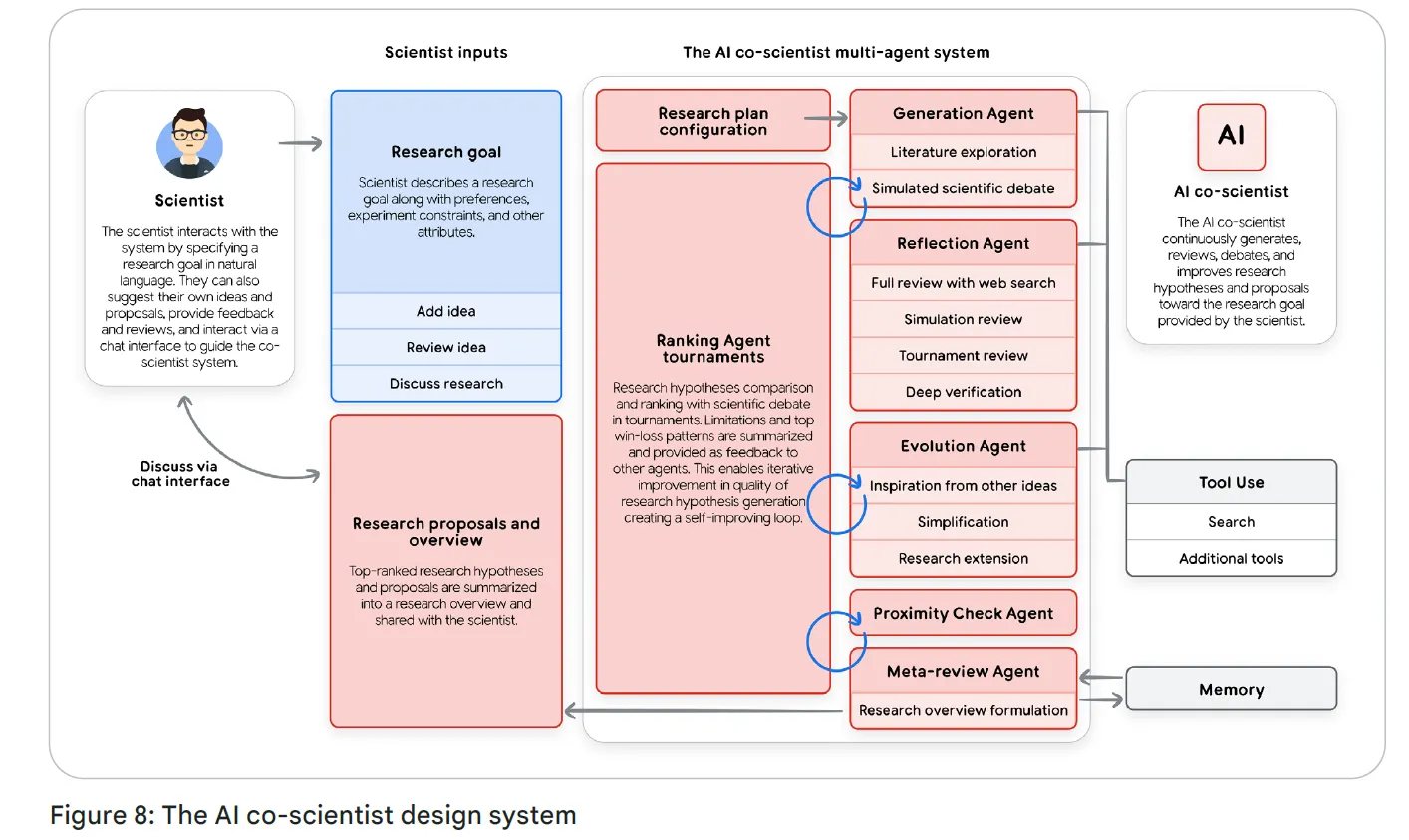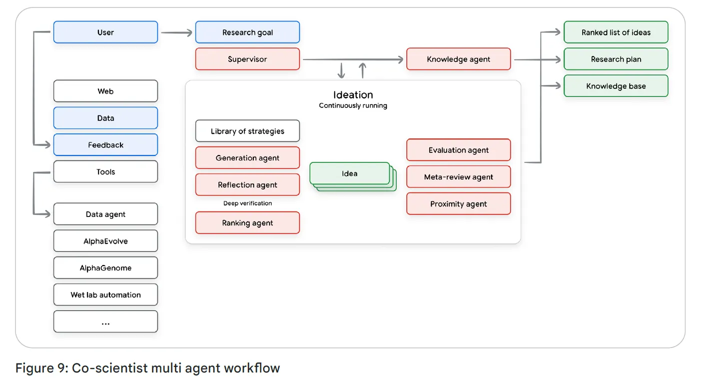 Для достижения этой цели Co-Scientist создаёт целую экосистему агентов, которые сотрудничают друг с другом.