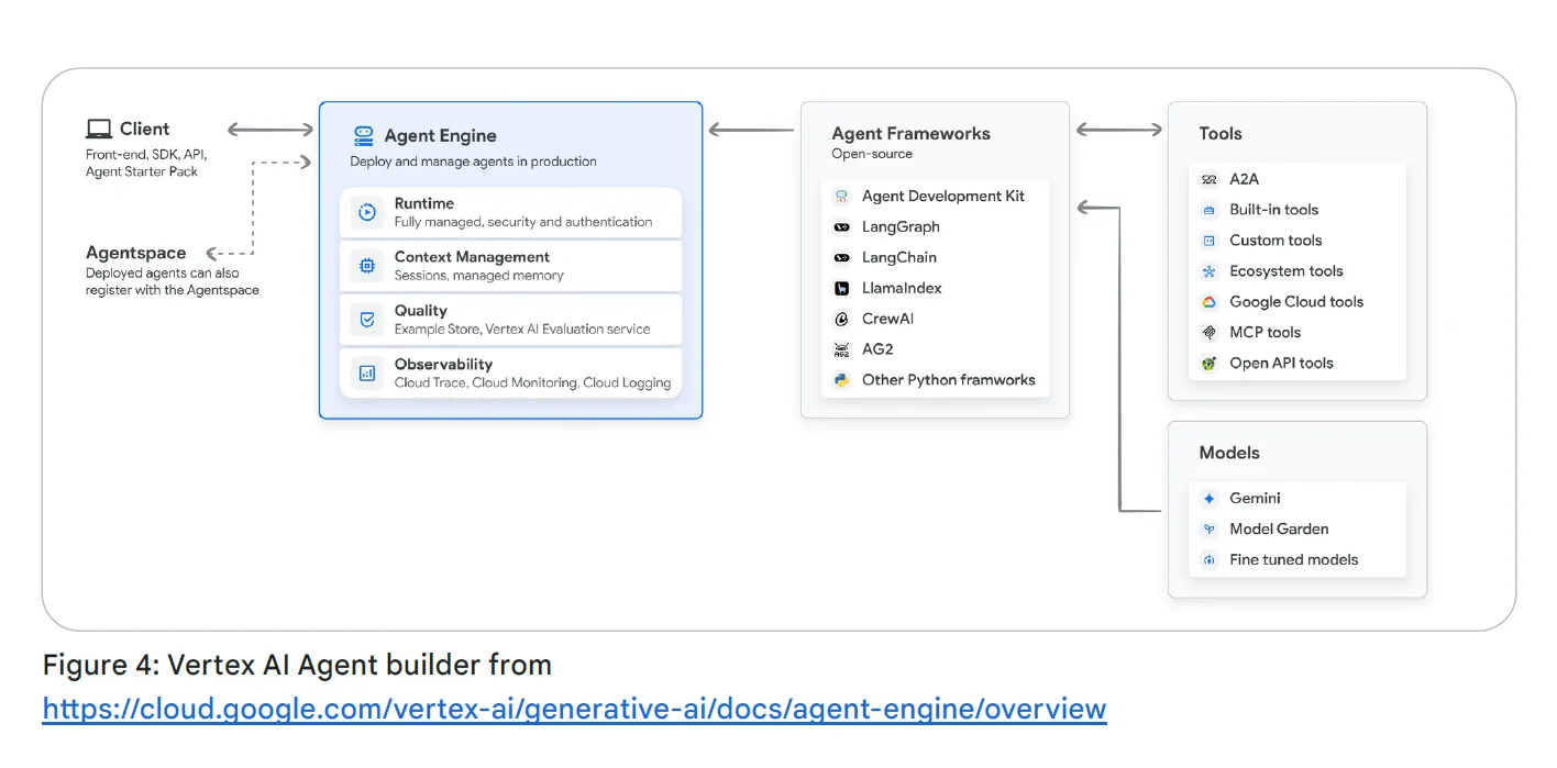 Развёртывание («Тело и ноги»): Хотя создание агента на ноутбуке эффективно для прототипирования, именно развёртывание в продакшене делает его надёжным и доступным сервисом. Это включает хостинг агента на безопасном, масштабируемом сервере и его интеграцию с основными сервисами для мониторинга, логирования и управления. После развёртывания агент становится доступен пользователям через графический интерфейс или программно для других агентов через Agent-to-Agent (A2A) API.