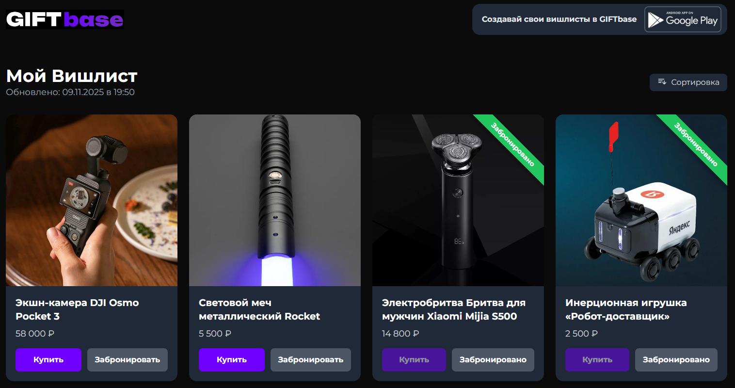 Так же, за пару вечеров собрал сайт mygiftbase.ru, с простым лендингом и функционалом просмотра вишлистов другими людьми — пользователь внутри приложения создаёт вишлист и публикует его, а его близкие могут по ссылке посмотреть подарки и забронировать их.