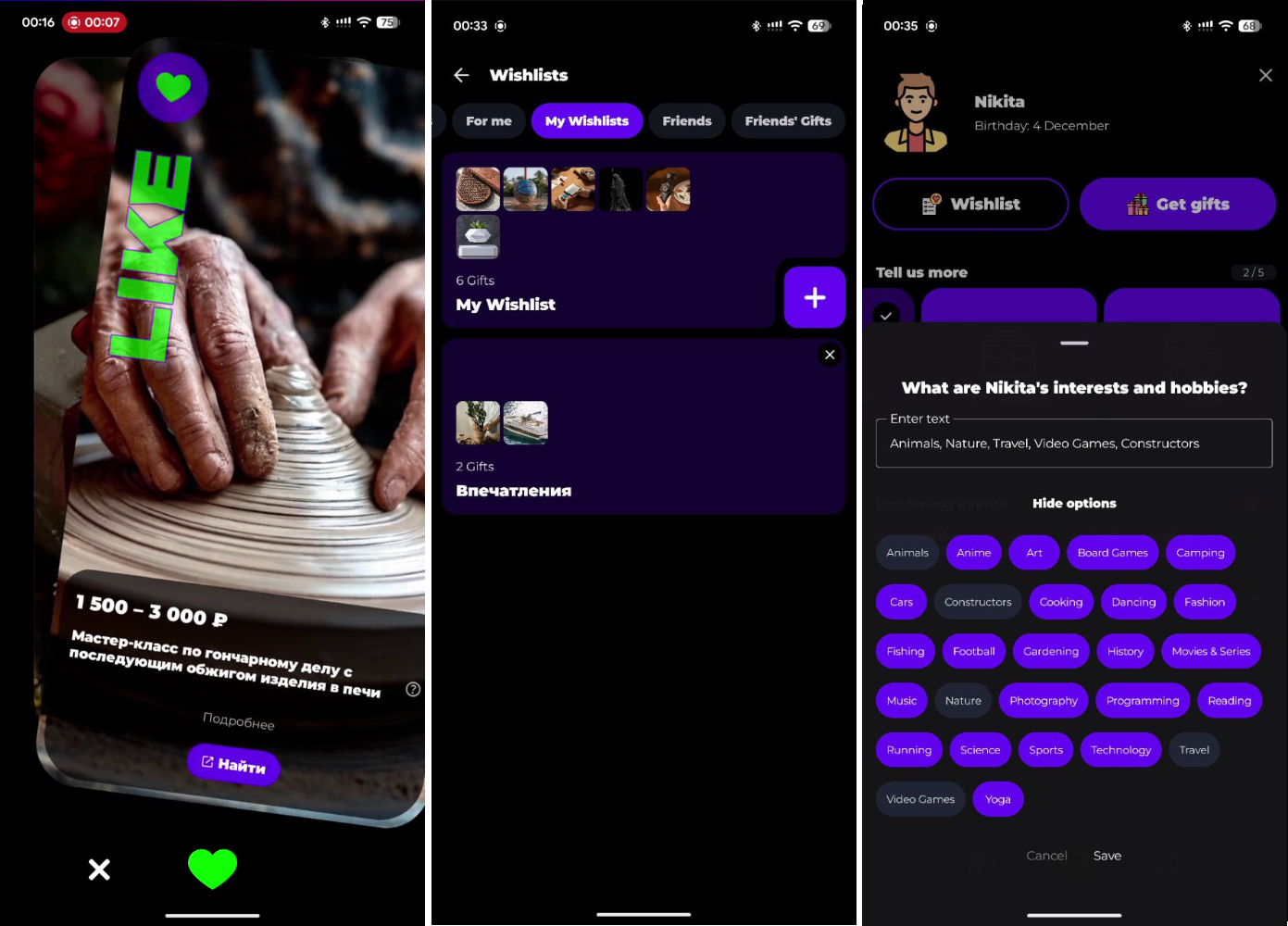 А вот в части выбора подарков ко мне сразу пришла идея. Сделать как в тиндере — удобно свайпать налево и направо. Интерактивный просмотр, который удержит пользователя и процесс не будет выглядеть, как нудное листание списка подарков.
