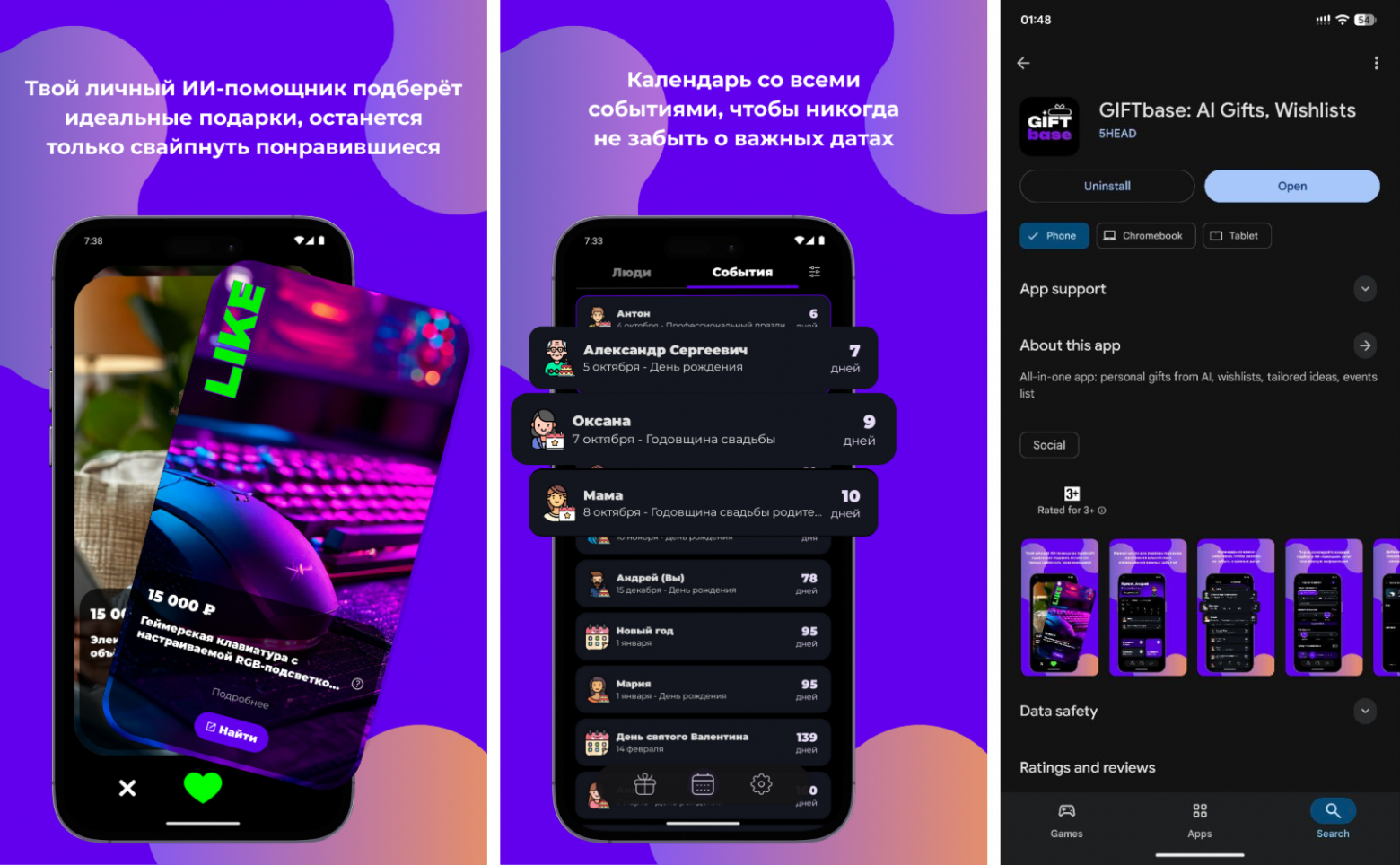 Перед тем как начать делать приложение с умной рекомендацией персональных подарков, я провёл разведку. Посмотрел Play Store на предмет наличия чего‑то похоже. И для понимания, что есть на рынке и для «вдохновения» — взять лучшие практики и улучшить слабые места.