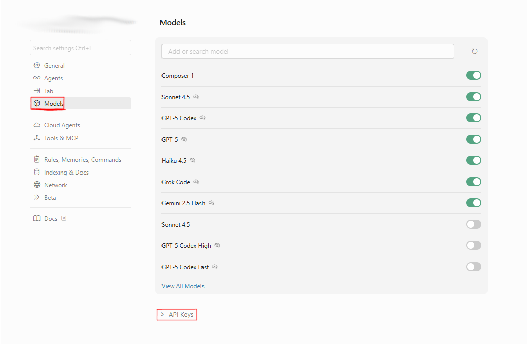 Возвращаемся в приложение Cursor и открываем настройки. Сделать это можно с помощью сочетания клавиш `Cmd + ,’ (Mac) или же ‘Ctrl + Shift + J’ (Windows/Linux), затем переходим во вкладку Models. Ну или просто не заморачиваться и нажать на шестеренку в правом верхнем углу.