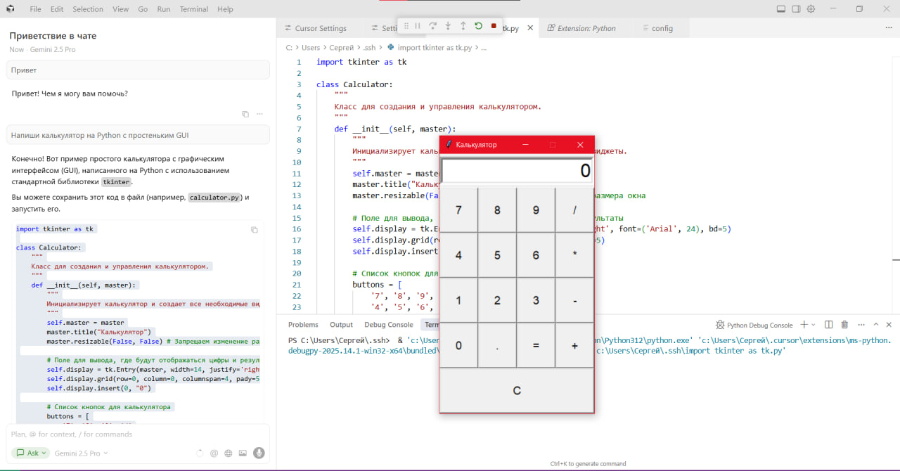 Куда уж без демонстрации работоспособности? Пусть напишет простенького калькулятора на Python.
