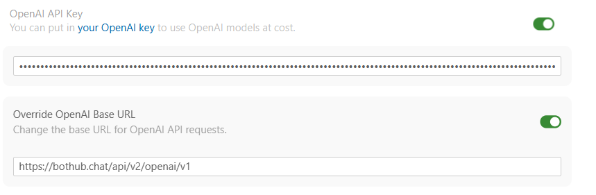 Открывшийся раздел содержит список моделей и ключей API. Здесь нас интересуют поля OpenAI API Key и OpenAI Base URL. Включите соответствующий переключатель.