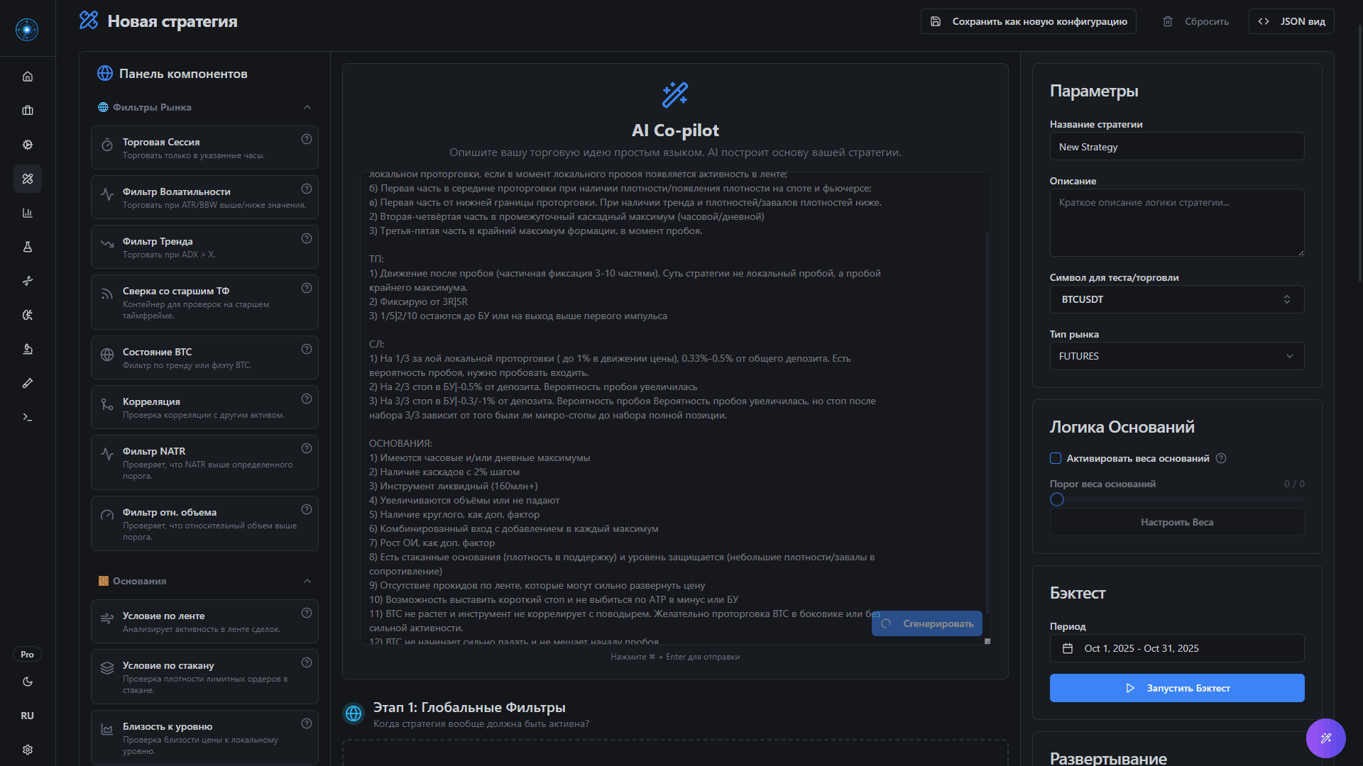 AI-ассистент парсит этот текст и за минуту генерирует готовую структуру в визуальном редакторе, которую можно подправить руками и тут же отправить на бэктест.
