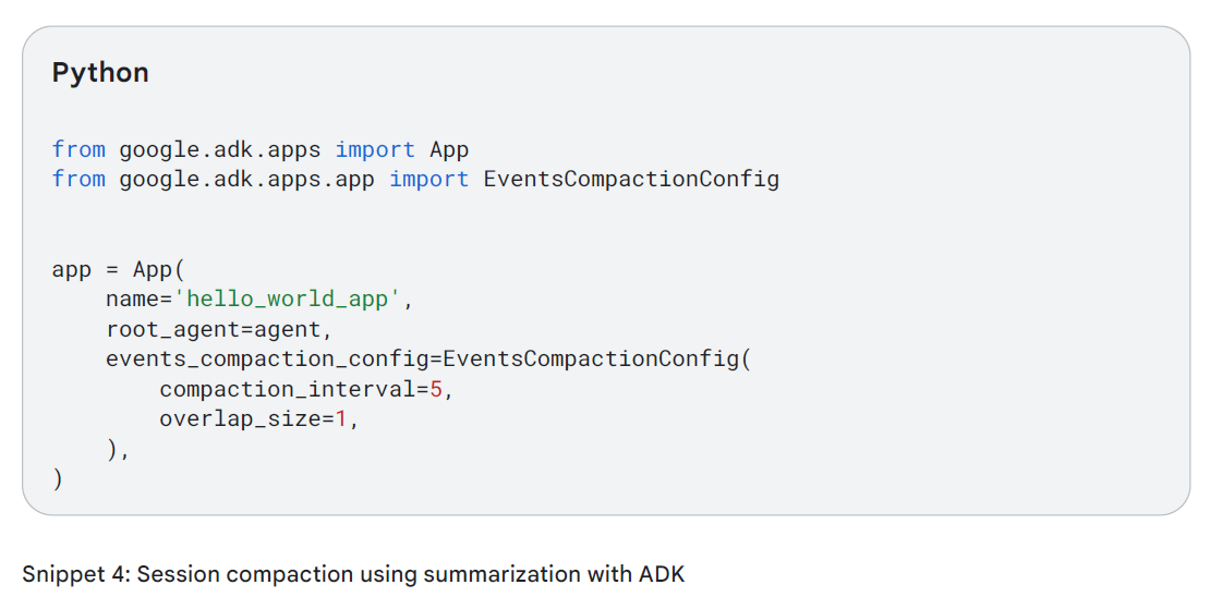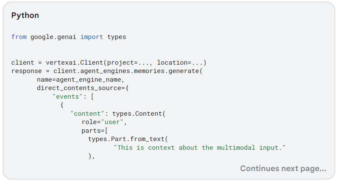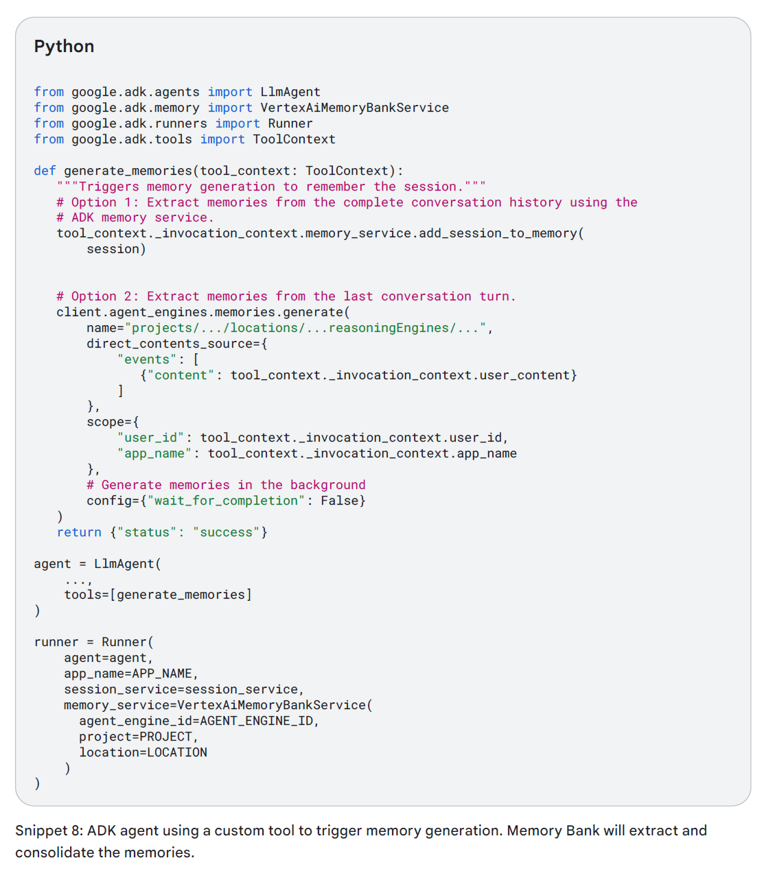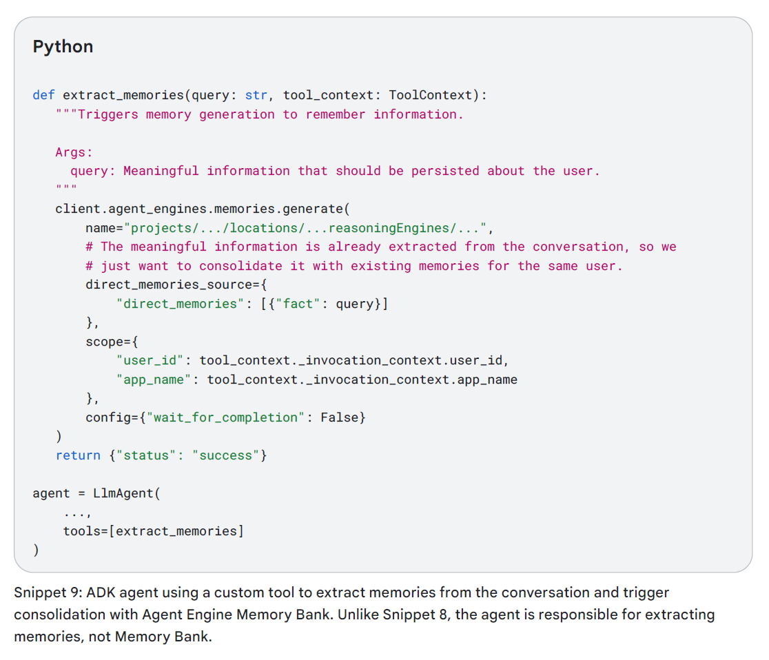 Например, в ADK вы можете сделать это, упаковав ваш код для генерации памяти в Инструмент (Tool)²¹, который агент будет вызывать, когда сочтёт, что диалог содержит что-то важное для сохранения. Вы можете отправить Session в Memory Bank, и Memory Bank извлечёт и объединит данные из истории диалога:
