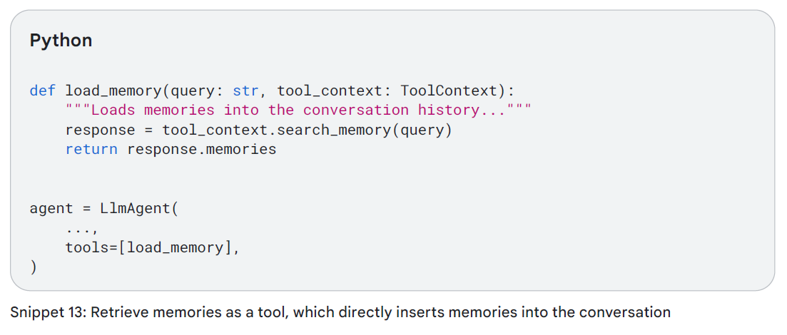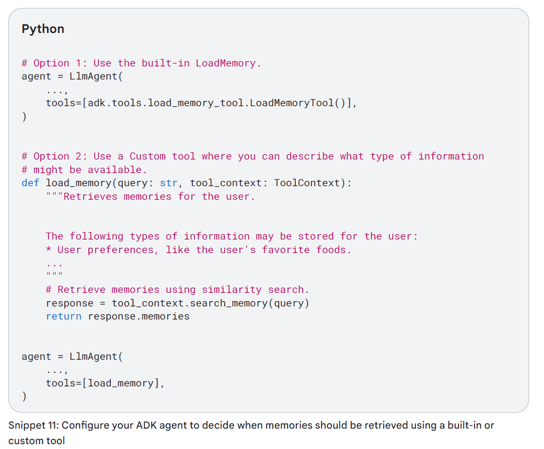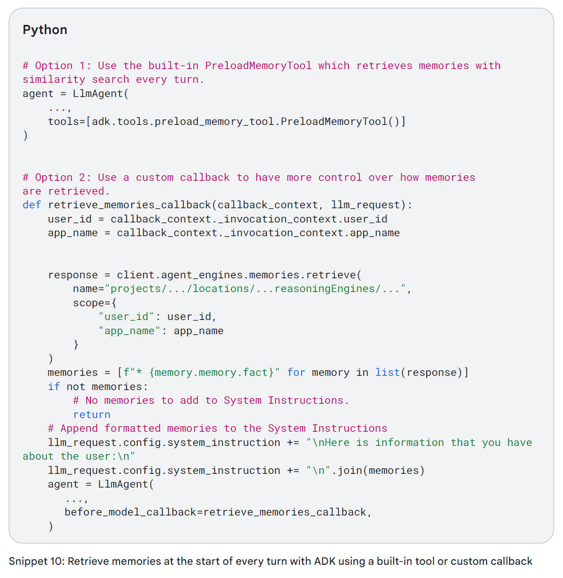 Например, в ADK вы можете реализовать проактивное извлечение, используя встроенный PreloadMemoryTool или кастомный коллбэк (custom callback)²⁵: