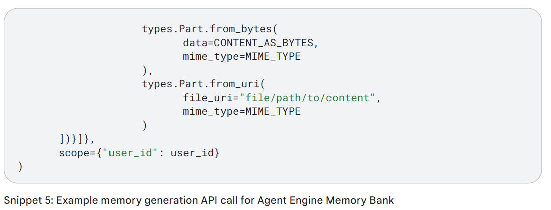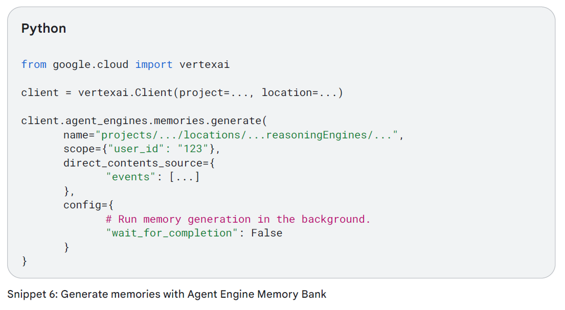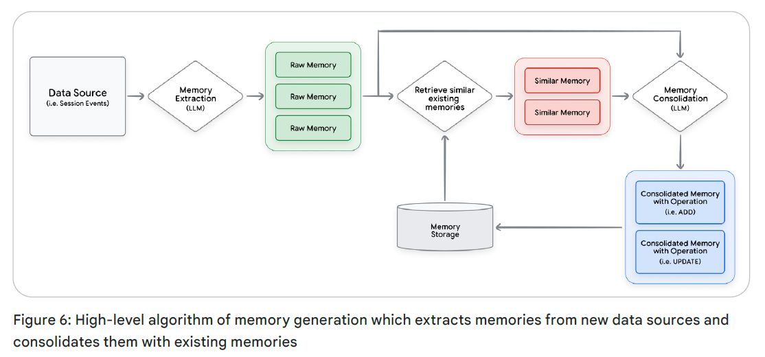 Опционально, эти извлечённые «воспоминания» затем могут быть отправлены в Agent Engine Memory Bank для их объединения (consolidation) с существующими данными пользователя²²: