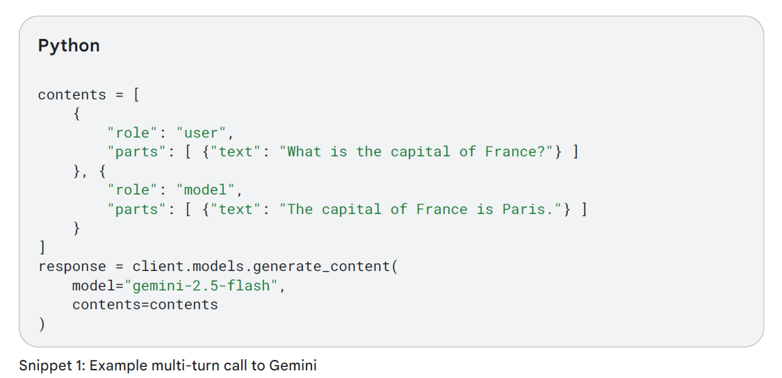 В конечном счёте, цель — сформировать «запрос» (request), который LLM сможет понять. Для моделей Gemini от Google это List[Content] (список объектов Content). Каждый объект Content — это простая, словарно-подобная структура с двумя ключами: role, который определяет, кто говорит ("user" или "model"), и parts, который содержит непосредственно само сообщение (текст, изображения, вызовы инструментов и т.д.).