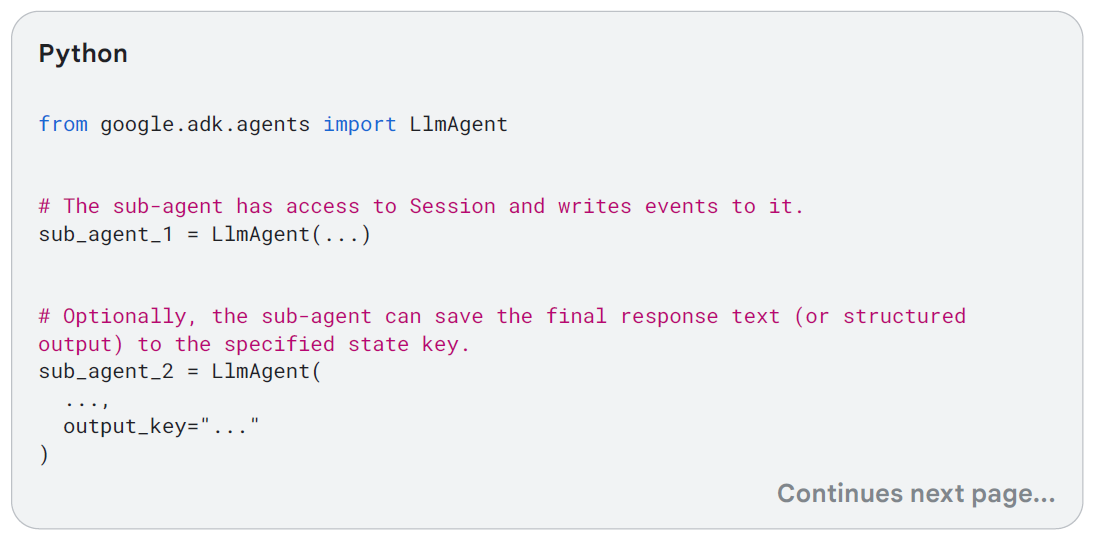 Если вы используете в ADK делегирование на основе LLM для передачи задач подагентам, все промежуточные события подагента будут записаны в ту же сессию, что и у корневого агента⁵.