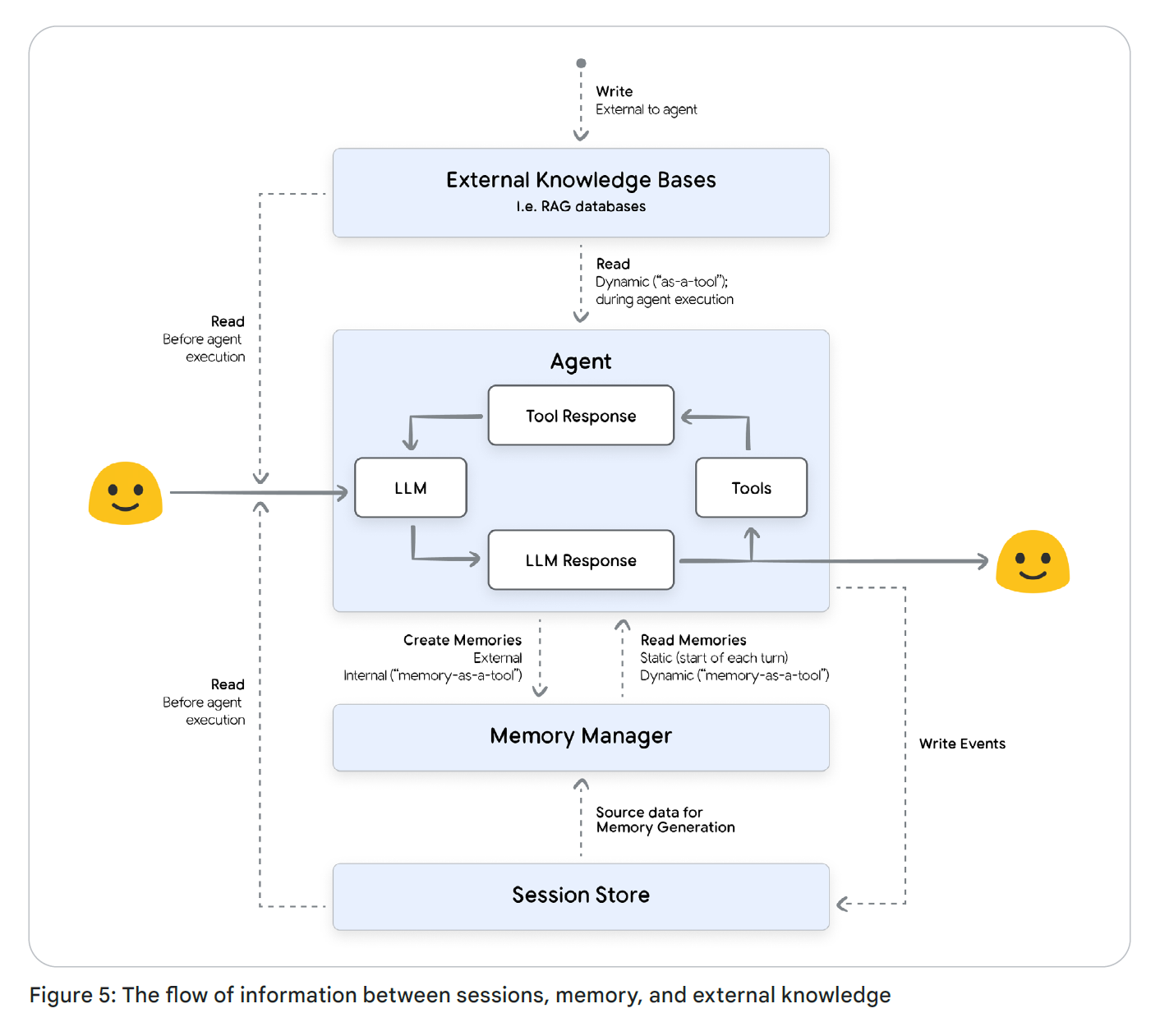 Эта аналогия напрямую отражает то, как работает эффективный агент: сессия служит временным рабочим столом для одного диалога, а память агента — это тщательно организованная картотека, позволяющая ему вспоминать ключевую информацию в ходе будущих взаимодействий.