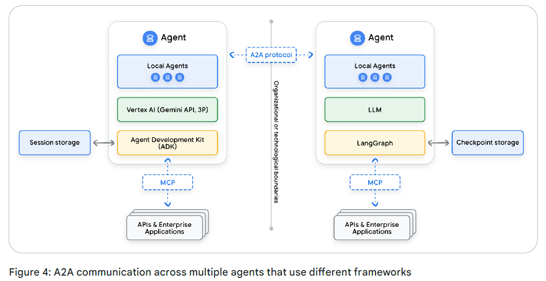 Одним из новых архитектурных паттернов для координации взаимодействия между такими изолированными агентами является протокол Agent-to-Agent (A2A)⁸. Хотя этот паттерн позволяет агентам обмениваться сообщениями, он не решает основную проблему — обмен полным/богатым, контекстным состоянием. История диалога каждого агента закодирована во внутренней схеме его фреймворка. Вследствие этого, любое A2A-сообщение, содержащее события сессии, требует наличия слоя трансляции, чтобы быть полезным.