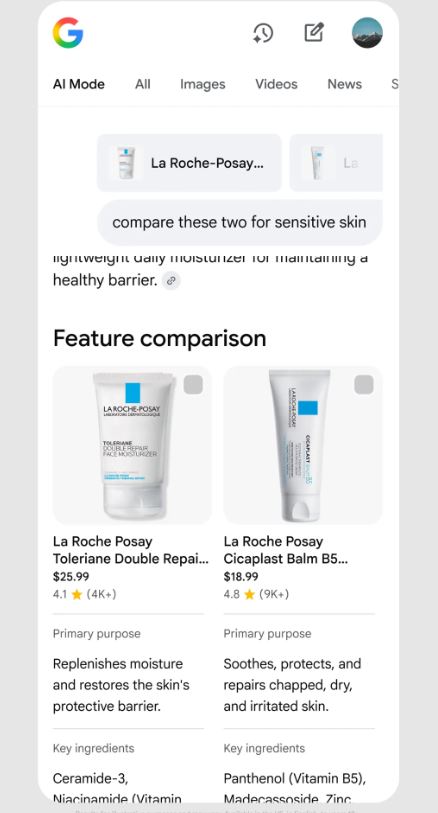 Во-первых, компания добавит функцию разговорного шопинга в режим ИИ-поиска: например, первоначальный поисковый запрос «женские свитера, которые можно носить с брюками или платьями» можно изменить, добавив «больше вариантов в серых тонах» вместо того, чтобы использовать фильтры и добавлять ключевые слова в запросы. Ответ на основе ИИ извлекается из хранилища Google, состоящего из 50 млрд листингов продуктов, и адаптируется к конкретному запросу: параллельная диаграмма, если пользователь ищет сравнение определенных товаров, или поток карточек изображений товаров, если он ищет общие предложения.