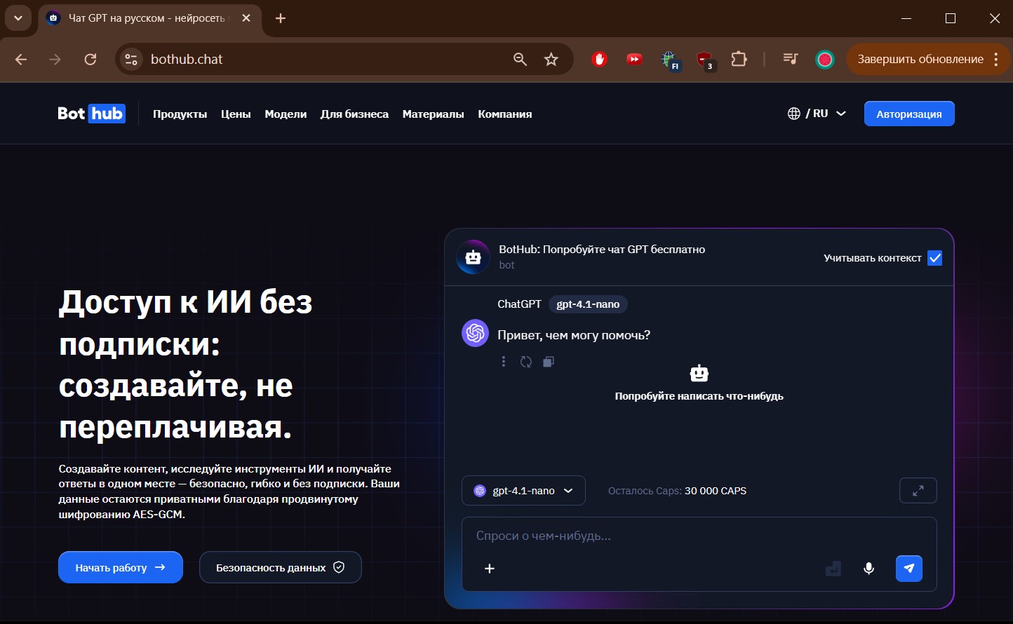 BotHub - это платформа, предоставляющая доступ к нейросетям без обязательной по��писки на нейросети. Пользователи могут генерировать контент, анализ данных и решать задачи в одном интерфейсе. Платформа акцентирует внимание на безопасности: данные шифруются с помощью AES-GCM, обеспечивая конфиденциальность. Доступна через веб-сайт, Telegram-боты нейросетей и мобильное приложение (Android, запущено 5 марта 2025 года). Подходит для российского рынка с поддержкой русского языка и локальными примерами использования.