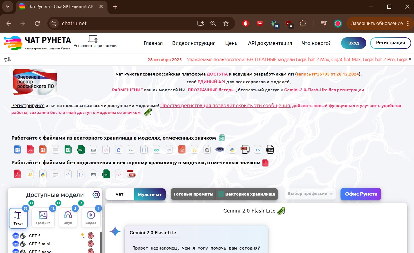 Бесплатный доступ к ИИ/чат: ChatRU - неограниченно базовые модели для проб.
