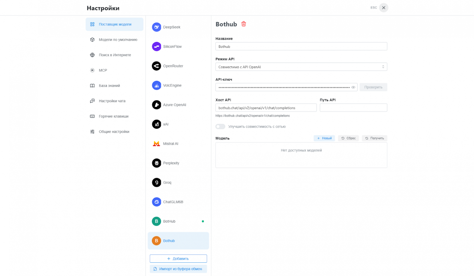 В раздел для API-ключа вставляем ключ, полученный ранее на сайте BotHub. Далее, в поле ввода хоста API вносим следующую ссылку: