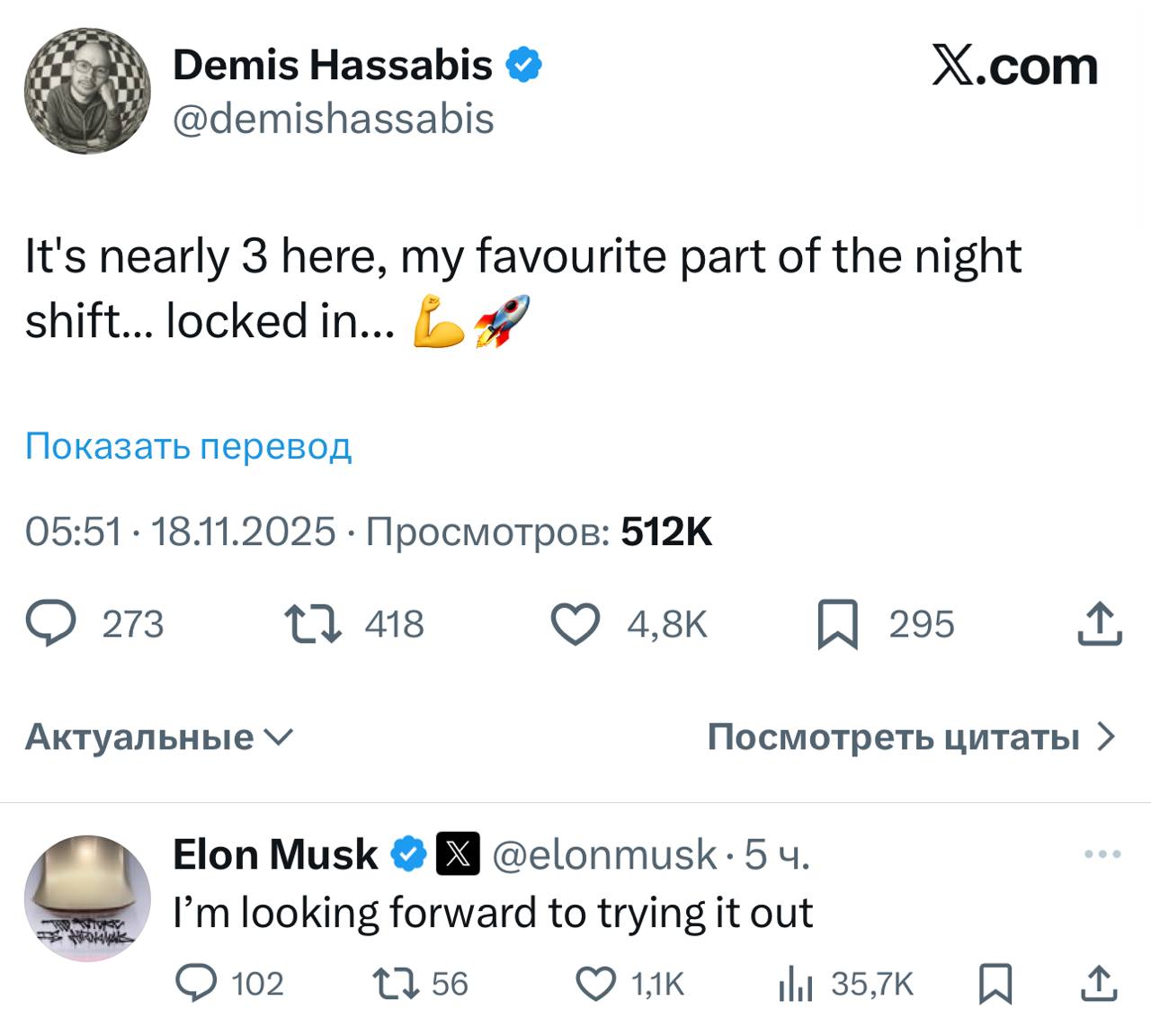 Кстати, сегодня топы Google в X недвусмысленно намекали на скорый выход Gemini 3.
