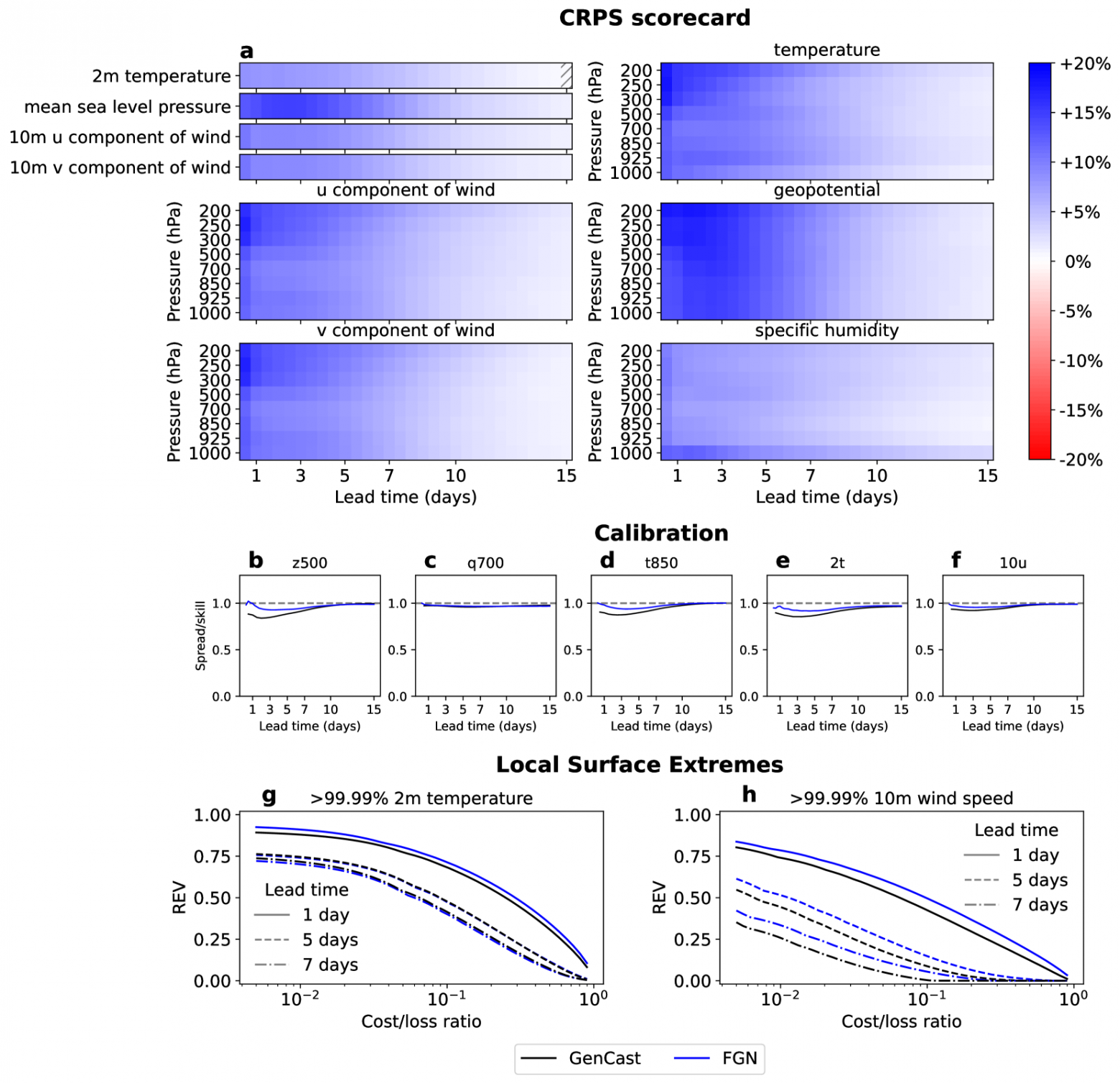 WeatherNext 2 строит прогнозы в восемь раз быстрее по сравнению с предыдущей версией и поддерживает шаг по времени до одного часа. В основе подхода лежит архитектура Functional Generative Network. Она добавляет шум прямо в модель, что позволяет генерировать физически связные прогнозы, а не просто один усреднённый вариант. Такой подход особенно важен в ситуациях, где требуется знать диапазон возможных рисков, например при оценке последствий штормов или сильных температурных скачков.