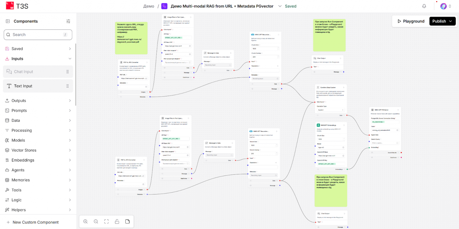 визуально собирать пайплайны, состоящие из блоков (обработка запроса, обращение к БД, вызов API, генерация текста, фильтрация, мультиагентная логика и др.);