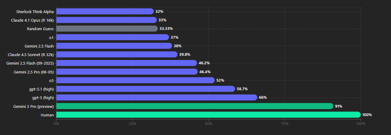 В нем Gemini 3 Pro значительно обходит ближайших конкурентов, почти дотягиваясь до человеческого уровня, который принят за 100%. Важно отметить, что пространственное мышление до недавнего времени считалось одной из главных проблем языковых моделей — слабая картина мира мешала им делать выводы о положении предметов относительно друг друга, оценивать размеры, возможность поместить один предмет в другой и так далее.