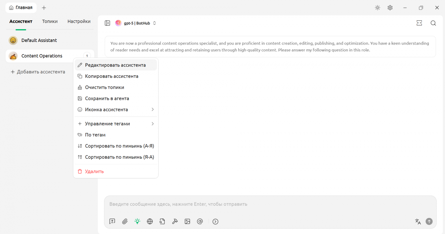 Если нужно начать новый разговор с текущим ассистентом, достаточно нажать + Новый топик и написать новый текст, чтобы диалог выглядел свежим.
