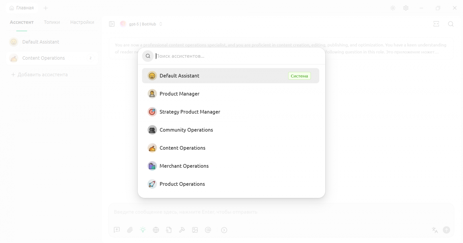 Благодаря этим компонентам ассистенты превращаются в небольшие ИИ‑персоны, каждая со своим стилем и сферами компетенции. Также в системе есть библиотека заготовленных ассистентов, насчитывающая несколько десятков моделей. Чтобы добавить такого помощника, нажмите кнопку + Добавить ассистента и выберите нужный вариант из списка.
