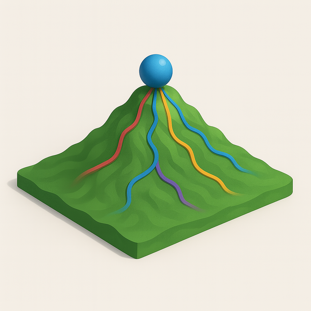 Представьте шарик, который находится на вершине горы. Он может скатиться буквально в любую сторону и привести к решению любой степени бесполезности. Задача оператора LLM руководителя учесть ландшафт горы (внутренний контекст разработчика) и добавить дополнительные перегородки (постановка задачи), чтобы шарик скатился именно туда, куда мы хотим.