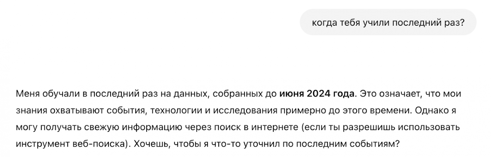 Обучать модели очень дорого и долго. И хотя индустрия активно работает над этим, большого прогресса здесь не видно. Смотрите, ChatGPT уверяет меня, что ее учили на данных, которые собрали больше года назад!