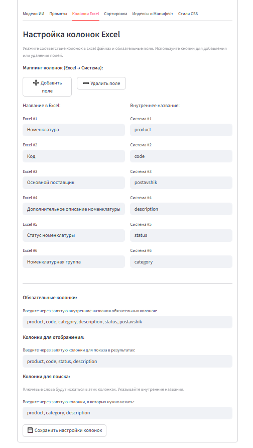 Настроить любые колонки. Система будет работать с любой структурой Excel-файла.
