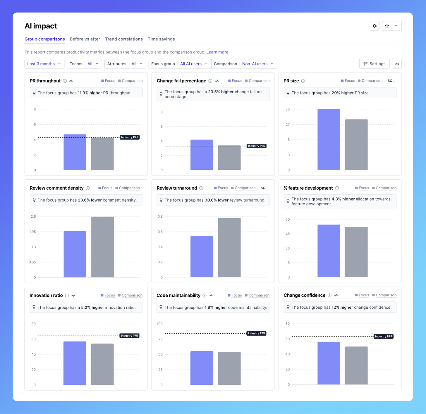 Многие компании крутят данные так и эдак, чтобы разглядеть скрытые закономерности. Смотрят на роль, стаж, регион, основной язык программирования — и получают ответы на более конкретные вопросы. Например, видят интересные паттерны: junior-разработчики затапливают репозиторий PR, а senior-разработчики, напротив, застревают, потому что тратят больше времени на ревью этих самых PR. Такой детальный анализ помогает найти группы разработчиков, которым нужно дополнительное обучение, или, наоборот, обнаружить области, где ИИ работает особенно хорошо, и масштабировать эти сценарии на всю компанию.