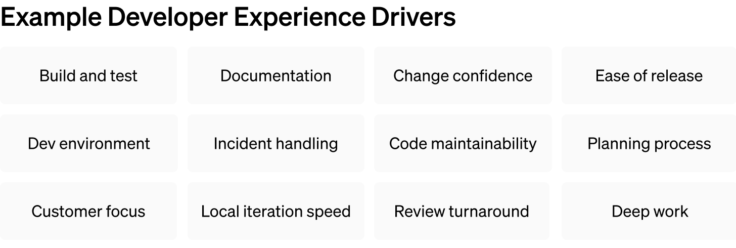 В целом, опыт разработчиков (DevEx) — ещё одна важная метрика, которая не дает перегнуть палку в погоне за скоростью в ущерб качеству. Правда, у самого понятия DevEx есть небольшая проблема в позиционировании: его легко принять за «корпоративные плюшки», тогда как на самом деле речь об устранении препятствий в процессе разработки — от планирования и написания кода до тестирования, релиза и поддержки в продакшене.