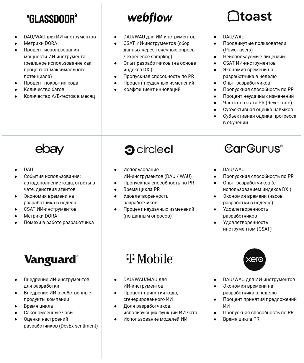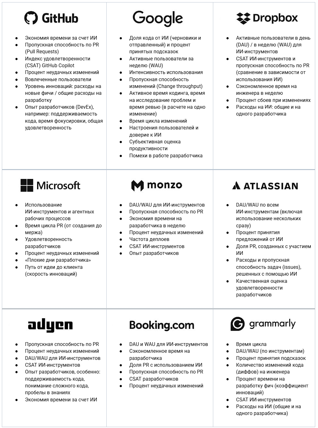 Для начала небольшой обзор реальных метрик, используемых компаниями для измерения влияния ИИ. Среди них GitHub, Google, Dropbox, Microsoft, Monzo, Atlassian, Adyen, Booking.com и Grammarly: