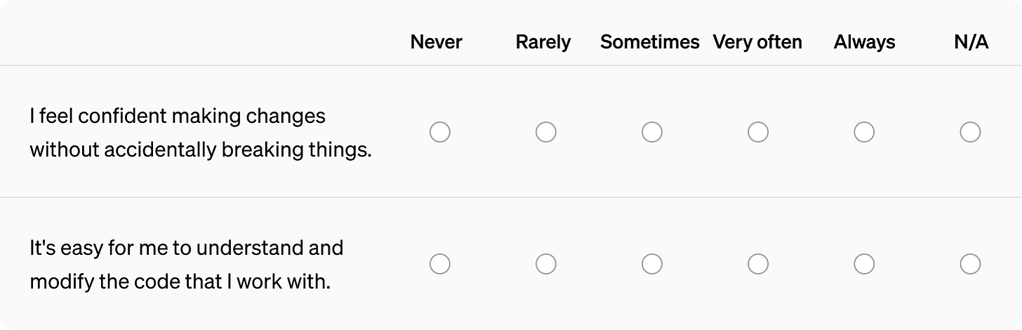 Но чтобы отследить четкую связь между использованием ИИ и изменениями в качестве и поддерживаемости, нужны более структурированные данные. Регулярные опросы об опыте разработчиков — отличный инструмент для этого.