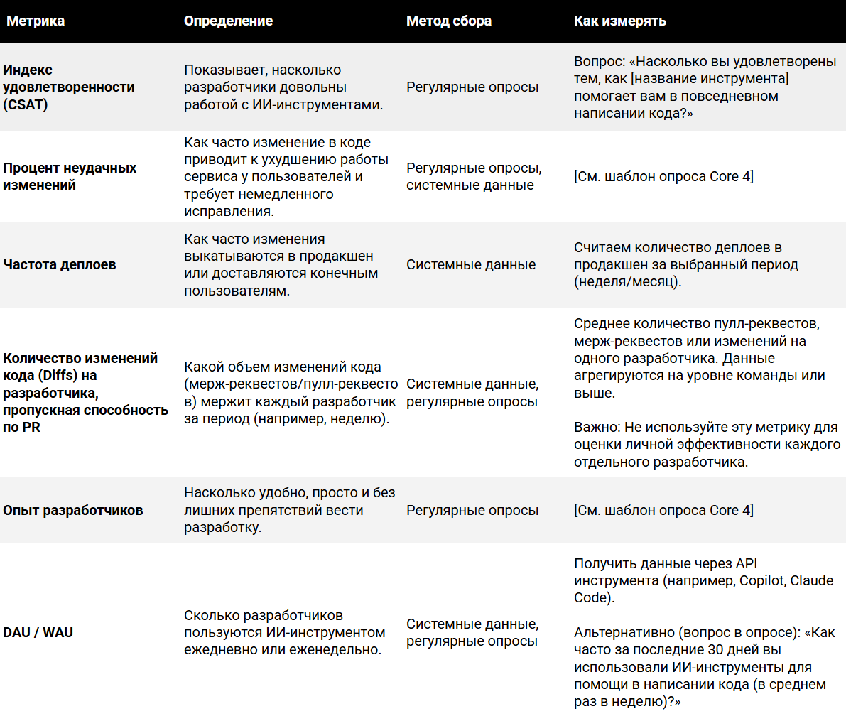 Чтобы картинка была полной, вам нужны и цифры, и «живые» данные от людей. С продуктивностью разработчиков так делают давно, с ИИ всё точно так же. Посмотрите на компании из этой статьи: все они комбинируют системные метрики (пропускная способность по PR, DAU/WAU) с данными из опросов (CSAT, сэкономленное время).
