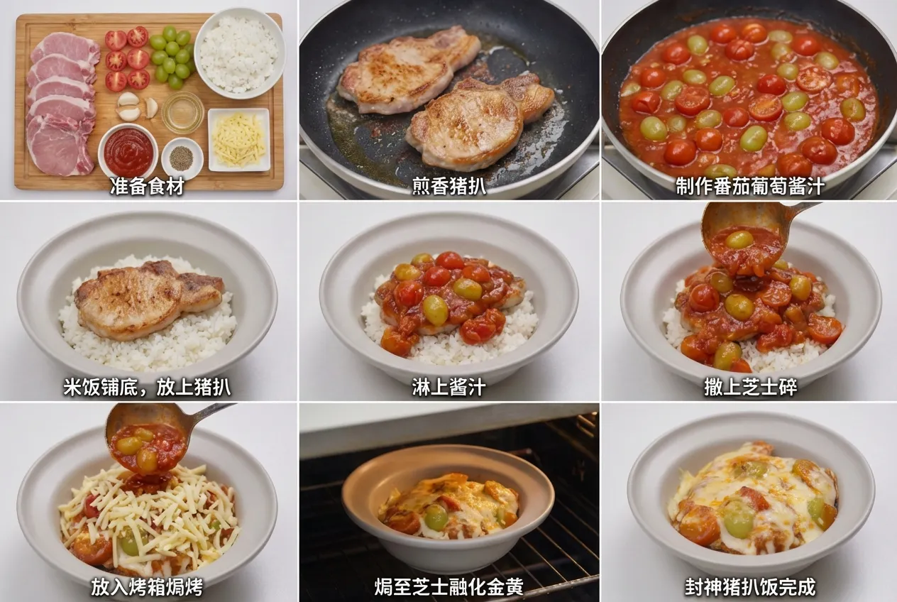 Создайте схему приготовления свиной отбивной по-гонконгски, показанной на изображении. Схема должна включать простые пошаговые инструкции и быть реалистичной.