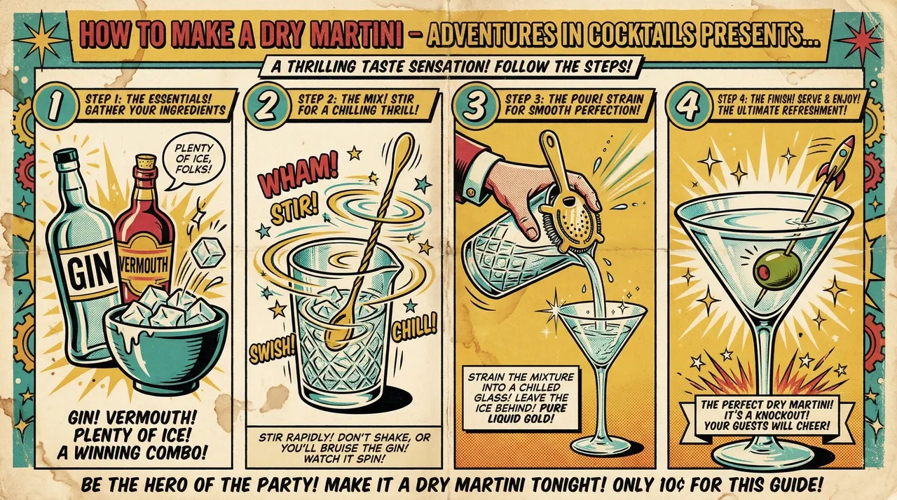 Дизайнинфографики в стиле ретро-комиксов 50-х годов. Тема: Как приготовить сухой мартини. Макет включает пошаговое руководство с пронумерованными иллюстрациями. Шаг 1: Стилизованная иллюстрация джина, вермута и большого количества льда. Шаг 2: Стакан для смешивания с барной ложкой, быстро помешивающей коктейль, линии движения обозначают движение. Шаг 3: Классический V-образный коктейльный бокал, через который прозрачная жидкость пропускается через ситечко. Шаг 4: Заключительный снимок готового коктейля с оливкой на палочке, искрящейся. Текстовые надписи жирные и блочные. Цветовая палитра: бирюзовый, горчично-желтый и вишнево-красный. Полутоновые узоры, текстура винтажной бумаги, жирная тушь, выразительные линии.