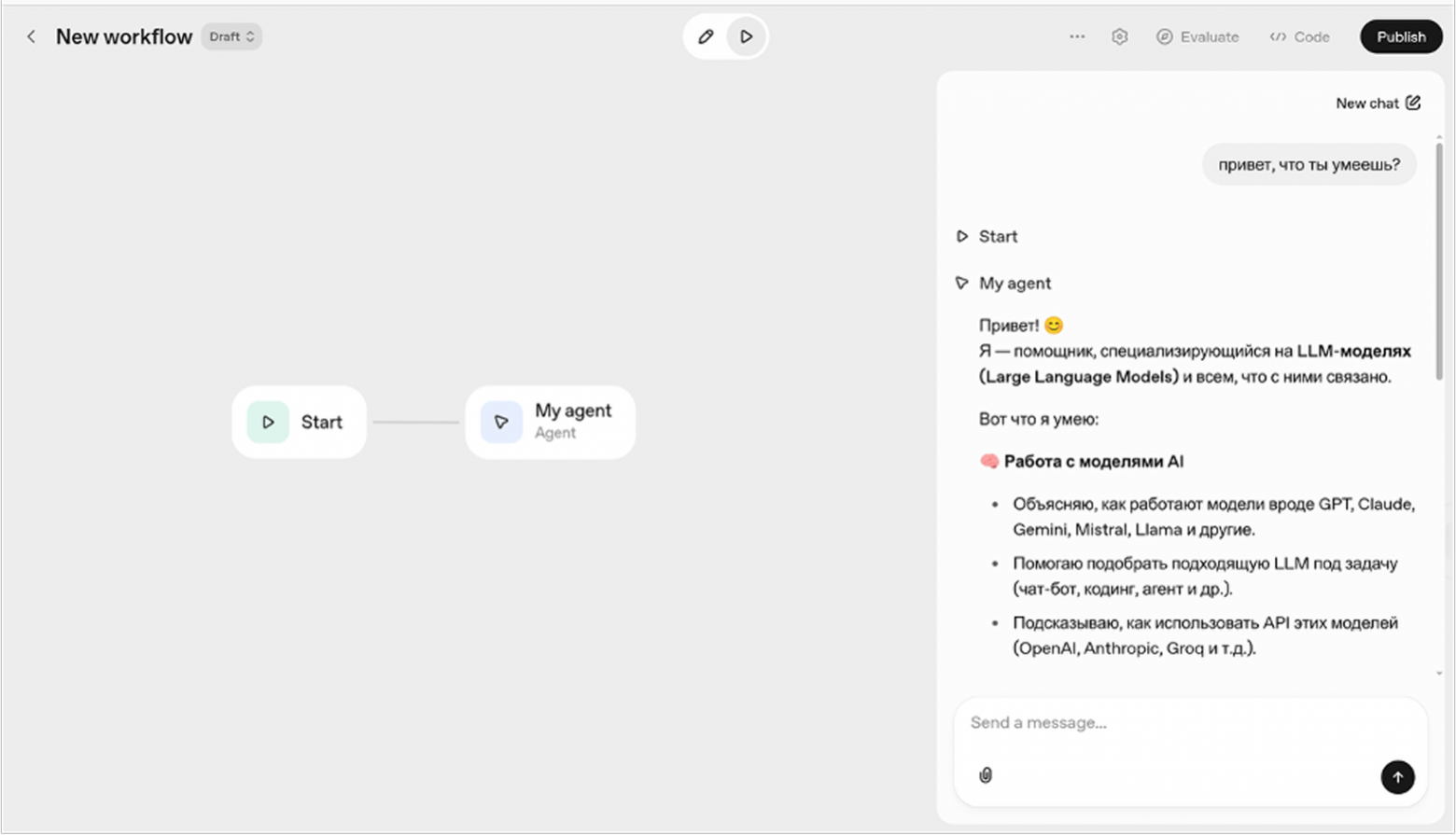 OpenAI также предоставляет встроенный чат-виджет для тестирования агента. После отладки вы можете получить готовый встраиваемый UI (Embeddable Chat UI) для интеграции агента на ваш сайт или в приложение. Однако лёгкой интеграции, допустим, в Телеграм или, тем более в телефонный канал, здесь ждать не стоит — эти функции придётся разрабатывать самостоятельно.