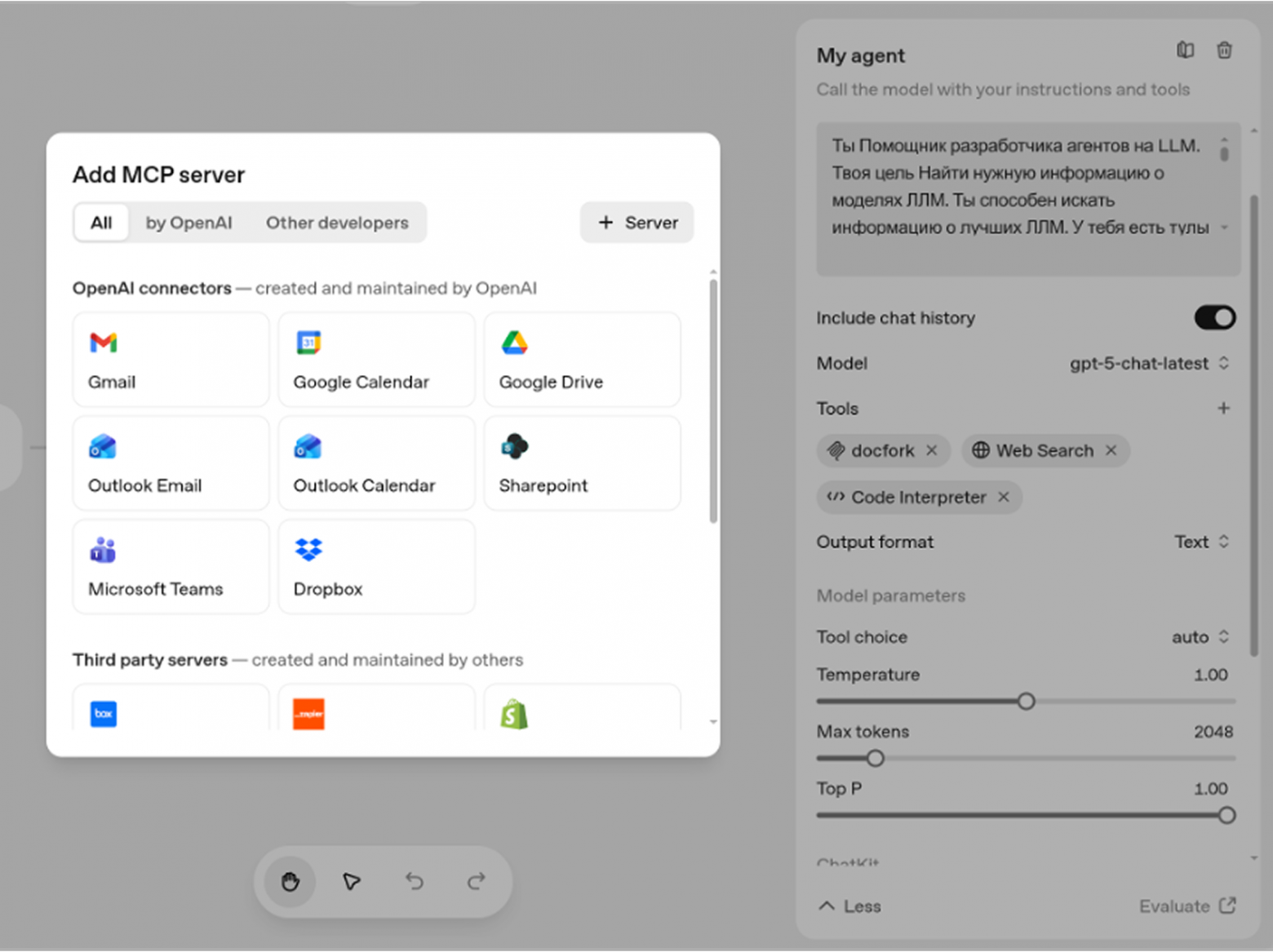 В OpenAI AgentKit инструменты можно подключить прямо в окне настройки агента рядом с другими опциями. При этом:
