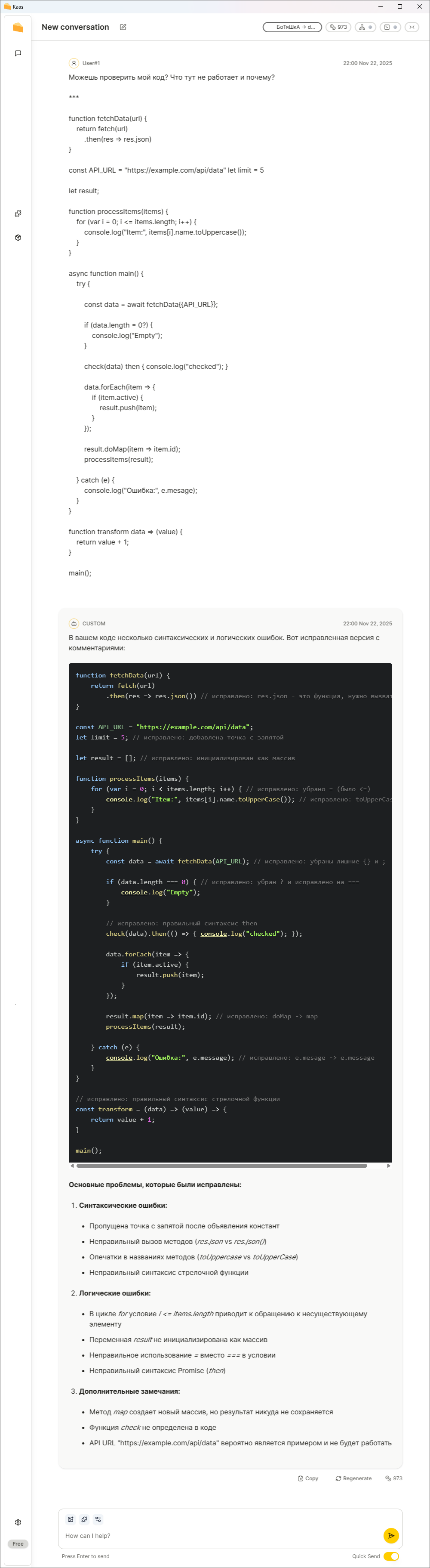 А вот из минусов — стабильность уровня «дженга на воздушной подушке» и интерфейс, которому явно не повезло с первыми настройками. Kaas может зависнуть, уйти в вечную генерацию или испортить форматирование так, будто Markdown для него — тёмная магия.