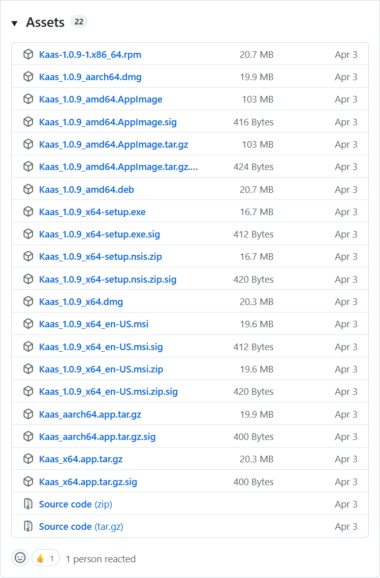 Для Windows подойдут Kaas_1.0.9_x64-setup.exe или Kaas_1.0.9_x64_en-US.msi.