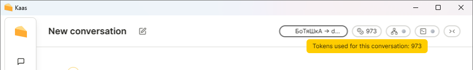 Итак, текст скользит по окну чат‑бота. Количество использованных токенов отображается под сообщением — Kaas сообщает, сколько проглотило ваше общение, удобная фича. А вверху справа показывается общий объём контекста в текущем диалоге: